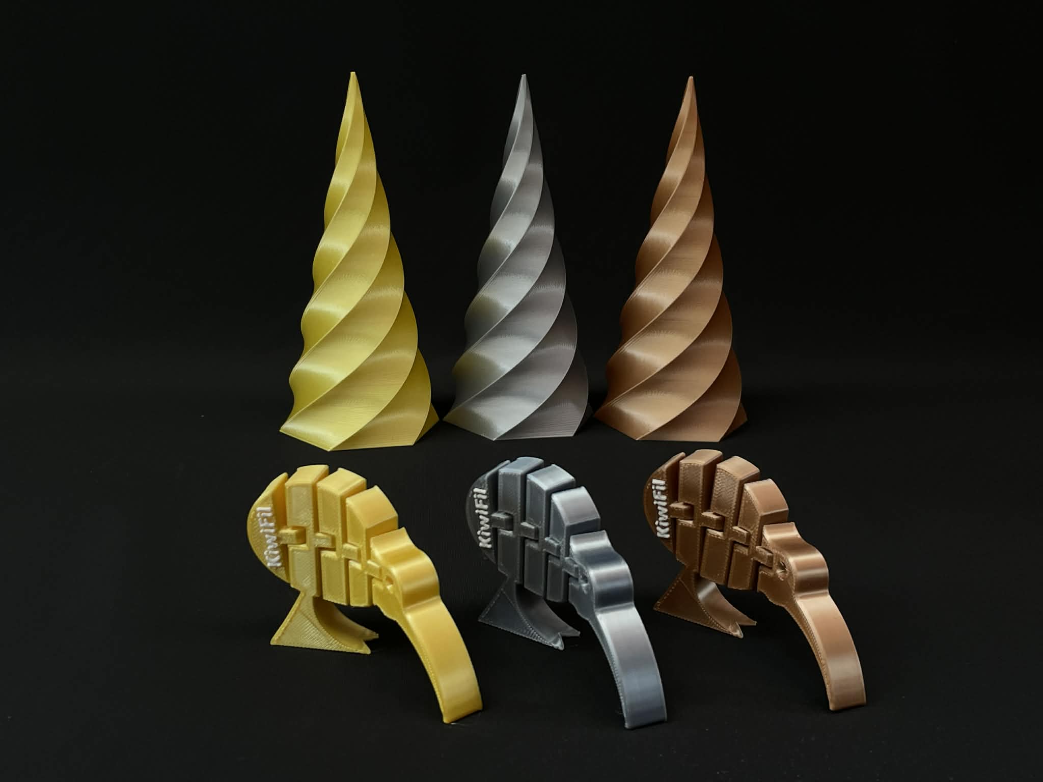 This silk rPLA prints with a shimmering and glossy finish, and is indistinguishable from virgin (new) material. It is made from 90 % recycled PLA, and 10 % magic (OK, it isn't really magic, but a blend of polymers such as TPU and PETG to get the shimmering effect). The recycled PLA is post-industrial waste from the manufacturing of food packaging, and from other recycled sources.