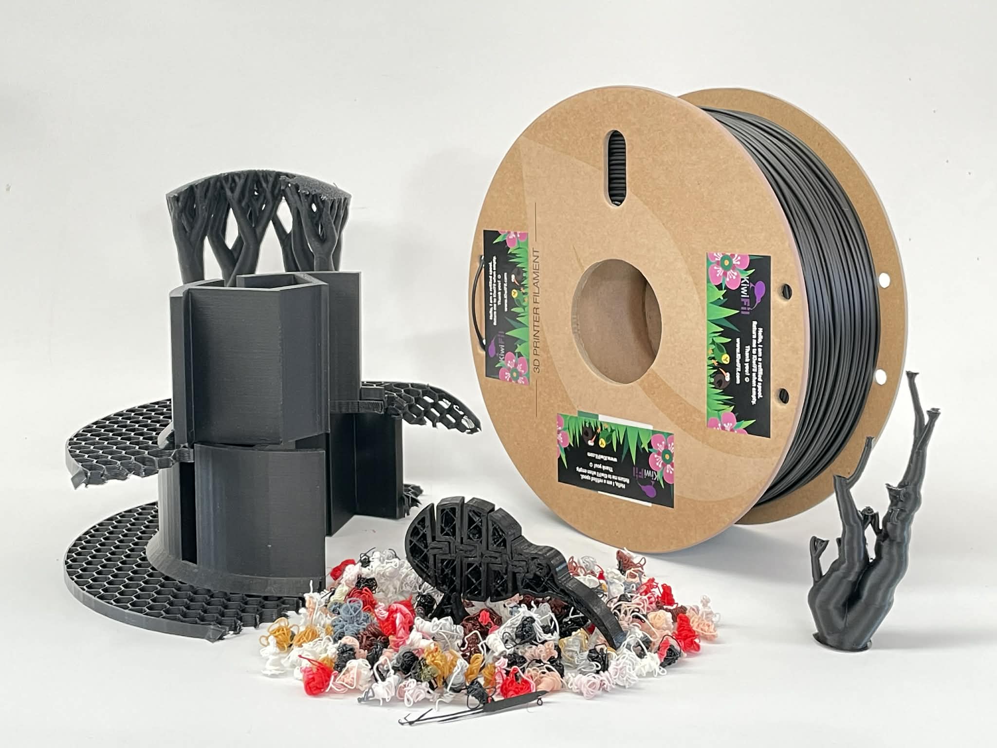 We take back all the KiwiFil packaging for re-use: boxes, spools, bags, desiccant packages, instruction cards, and any other packing material. The packing material will be re-used for new products, or recycled if the condition doesn't allow for re-use. We also happily take empty 1 kg plastic and fibreboard/cardboard spools from other brands for re-use.